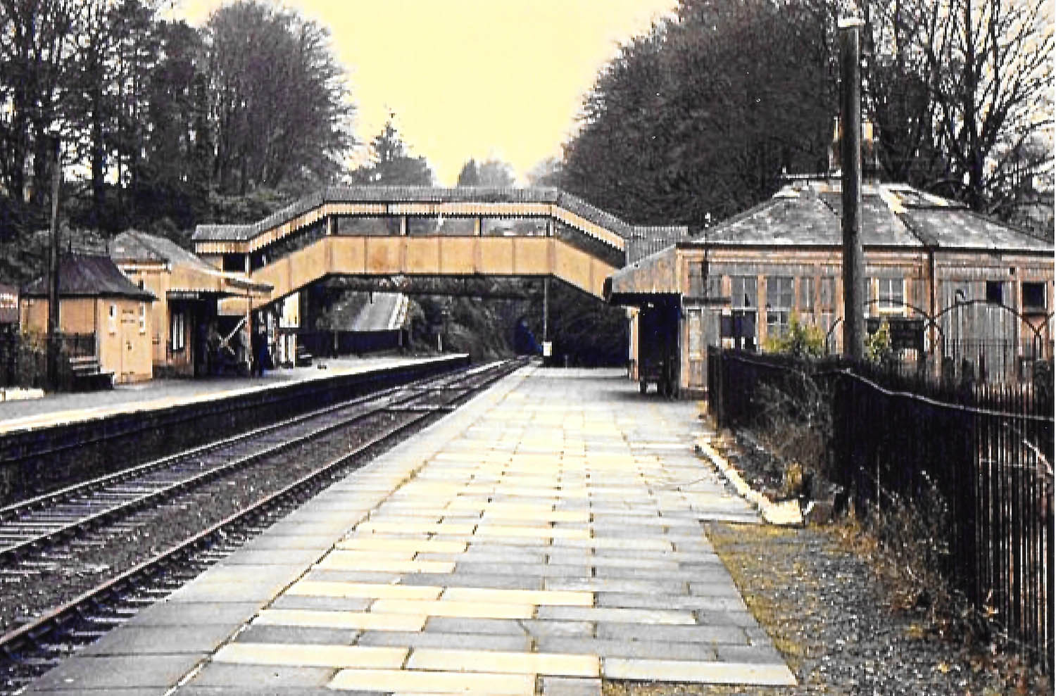 Yelverton Station also featured a goods yard, a corrugated iron pagoda shelter, and a water crane positioned at the northern end of the platform. A large wooden nameboard reading “Yelverton—change for the Princetown Branch” dominated the station’s southern end until the branch line closed in 1956.